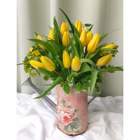 See more ideas about flower arrangements, tulips, tulip wedding tulip flower arrangement. A metal jug with yellow, pink.